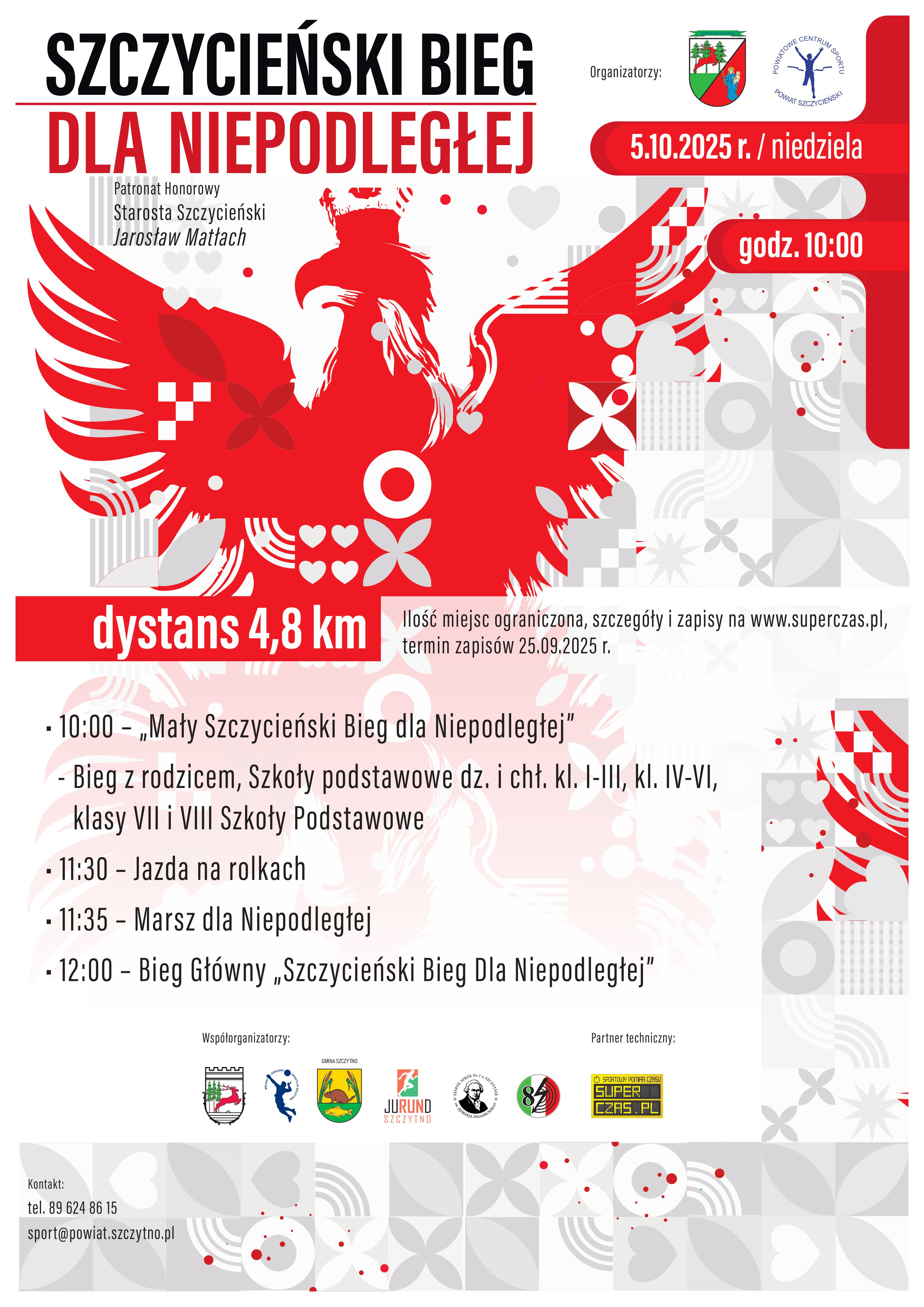 Tradycyjnie oprócz biegu głównego na dystansie 4,8 kilometra odbędzie się również jazda na rolkach oraz Marsz dla Niepodległej. Najmłodsi zmierzą się w "Małym Szczycieńskim Biegu dla Niepodległej".
