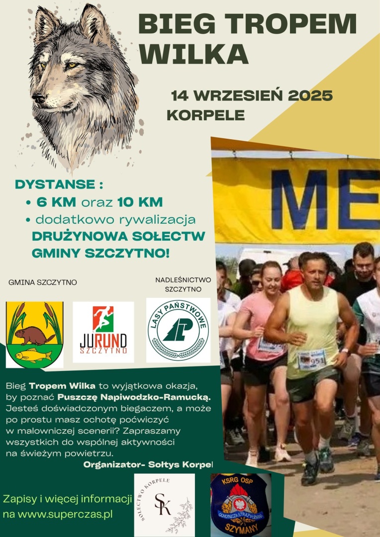 14 września w Korpelach wystartuje „Bieg Tropem Wilka”. Baza wydarzenia: Świetlica wiejska w Korpelach (Korpele 29T). Starty: 10:50 – bieg na 10 km, 11:00 – bieg na 6 km
