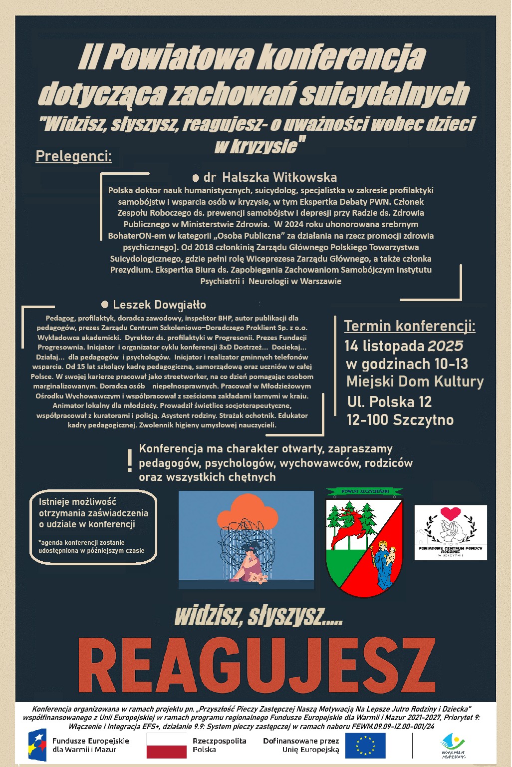 Zapraszamy na II Powiatową Konferencję dotyczącą zachowań suicydalnych pod hasłem „Widzisz, słyszysz, reagujesz – o uważności wobec dzieci w kryzysie”, która odbędzie się 14 listopada 2025 r. w godz. 10:00–13:00 w Miejskim Domu Kultury w Szczytnie, ul. Polska 12.