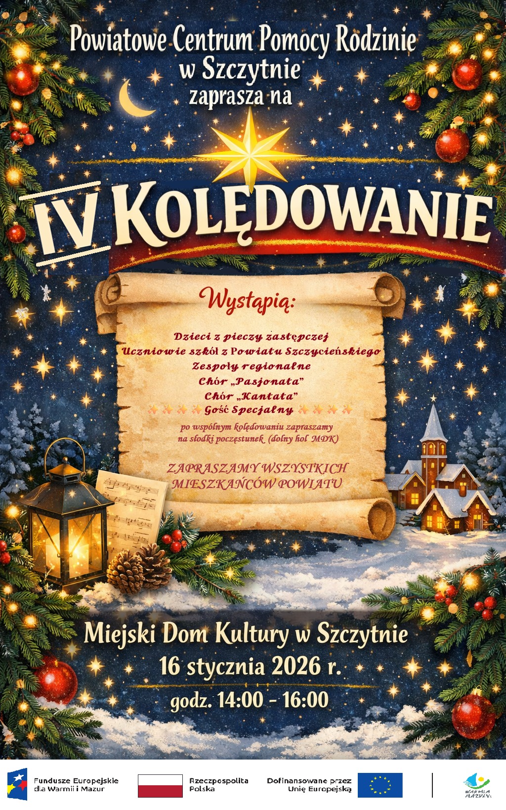 W piątek, 16 stycznia 2026 roku, w Miejskim Domu Kultury w Szczytnie przy ul. Polska 12, w godzinach 14:00–16:00 odbędzie się świąteczny koncert kolęd i pastorałek z udziałem dzieci z pieczy zastępczej, uczniów szkół z Powiatu Szczycieńskiego, zespołów regionalnych oraz chórów „Pasjonata” i „Kantata”, a także gościa specjalnego.