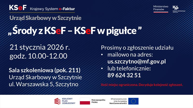 Zapraszamy do udziału w kolejnym szkoleniu z cyklu "Środy z KSeF - KSeF w pigułce", które odbędzie się 21 stycznia w siedzibie Urzędu Skarbowego w Szczytnie.