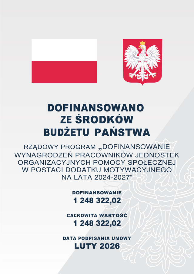 Powiat Szczycieński realizuje Rządowy Program „Dofinansowanie wynagrodzeń pracowników jednostek organizacyjnych pomocy społecznej w postaci dodatku motywacyjnego na lata 2024-2027”. W ramach realizowanego programu środki przeznaczone są na zwiększenie wynagrodzeń oraz pokrycie kosztów od tych wynagrodzeń dla pracowników jednostek organizacyjnych pomocy społecznej tj. dla pracowników: Powiatowego Centrum Pomocy Rodzinie w Szczytnie, Ośrodka Interwencji Kryzysowej w Szczytnie, Środowiskowego Domu Samopomocy w Szczytnie, Domu Pomocy Społecznej w Szczytnie.