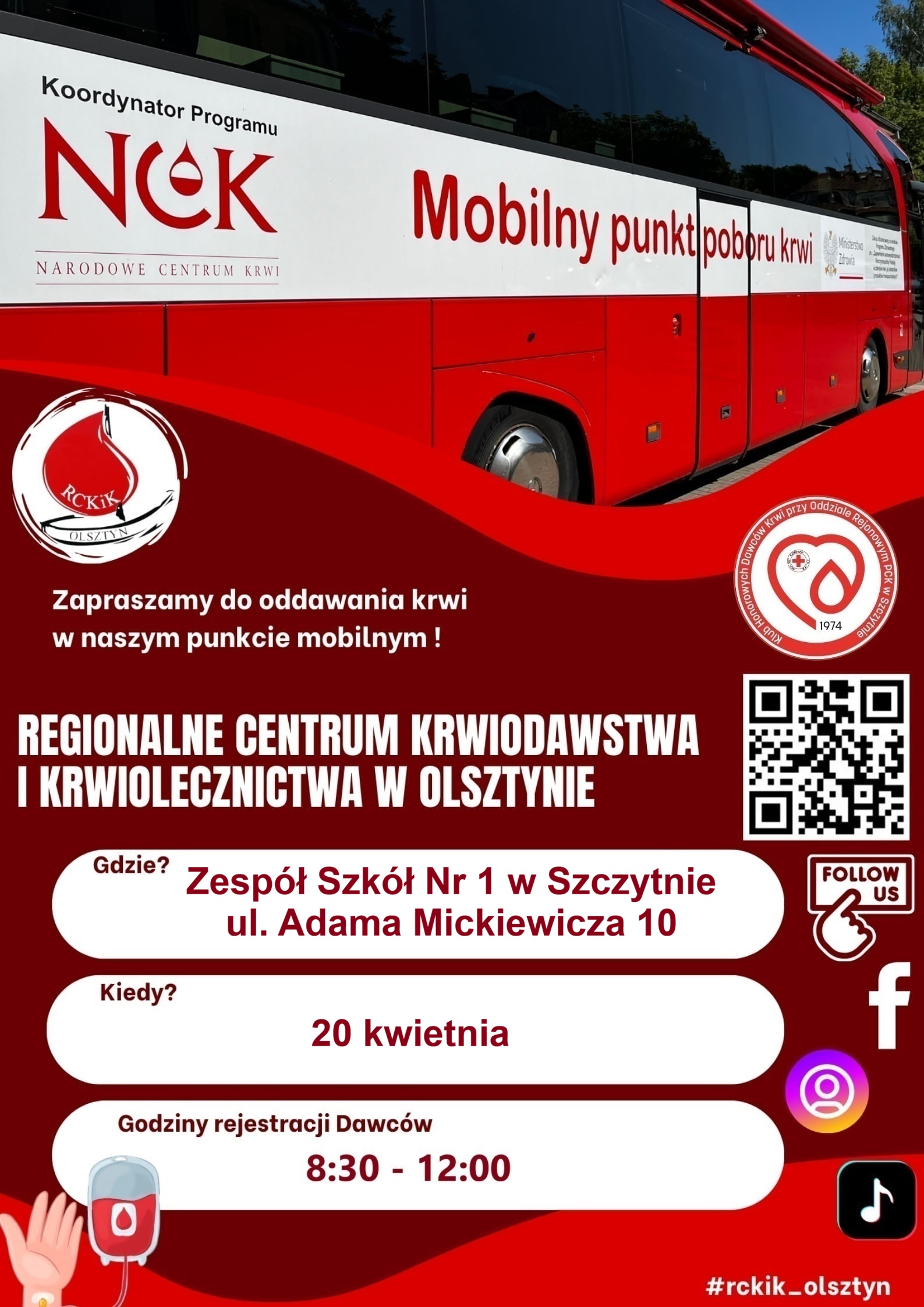 W poniedziałek, 20 kwietnia, w godzinach 8:30–12:00 przy Zespole Szkół nr 1 w Szczytnie przy ul. Adama Mickiewicza 10 odbędzie się mobilna akcja krwiodawstwa. Zapraszamy wszystkich chętnych do rejestracji i oddania krwi w tym szlachetnym celu. Wydarzenie to szansa na uratowanie życia – dołącz i podziel się darem.